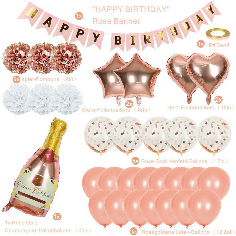 ❤【Hochwertiger Rosegold Luftballons】Paket beinhaltet: "HAPPY BIRTHDAY" Banner, Papier Pompons, Fünfzackige Sternfolienballons, herzförmige Alufolienballons, Champagner Ballons, Konfetti Ballons, Latexballons, Ballonband.